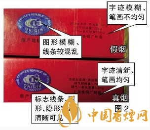 真品“中華”印刷套色準確,字跡清新、筆畫均勻,字樣邊緣呈細微的齒輪狀,而不是人們普遍認為的平滑狀。假煙字跡模糊、筆畫不均勻,字樣邊緣呈平滑狀。真品“中華”原產(chǎn)地標志采用中國地圖圖案,細看海南島和臺灣島為空心,在某些角度和光線下圖案背景會呈現(xiàn)“中華”字樣,標志線條、圖形、隱形字跡清晰可見。假煙原產(chǎn)地標志圖形模糊、線條較混亂。