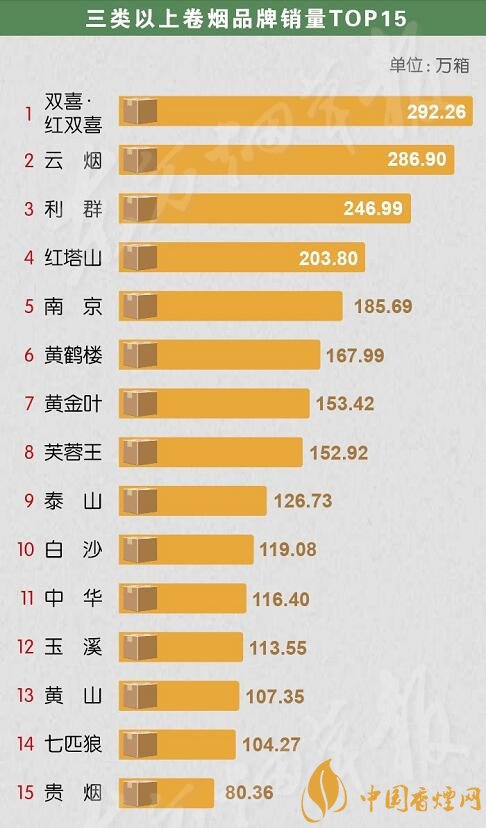三類以上卷煙品牌銷量中,百年香煙品牌雙喜紅雙喜以微弱的優(yōu)勢(shì)位居榜首,云煙緊隨其后與排名第三的利群拉開差距。紅塔山、南京、黃鶴樓、黃金葉、芙蓉王分別位居4-8位,銷量也維持在一百五十萬箱以上,泰山、白沙、中華、玉溪、黃山、七匹狼、貴煙雖然銷量在一百五十萬箱以下,但都榜上有名,分別占據(jù)9-15位。一直以來,三類卷煙作為全國卷煙市場(chǎng)的中堅(jiān)力量,其市場(chǎng)份額之高、覆蓋面之廣、影響力之深,始終備受行業(yè)內(nèi)外的關(guān)注。
