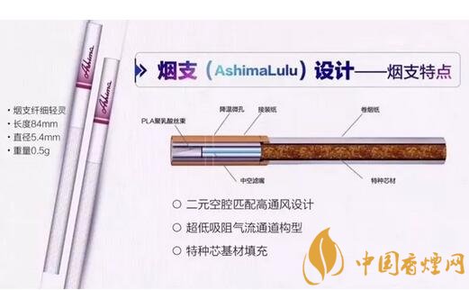 煙支Ashima Lulu,為纖細型,長84mm,直徑5.4mm,重量只有0.5克。具有二元空腔匹配高透風設計、超低阻氣流通道構(gòu)型、特種芯基材填充等特點。