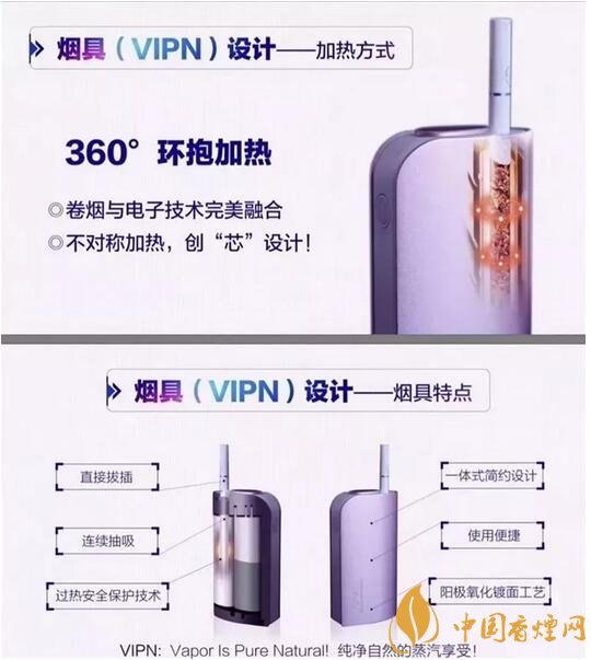 看到海報圖片上面介紹說,煙具VIPN為360度環(huán)抱加熱,具有直接拔插、連續(xù)抽吸、過熱安全保護技術等特點。