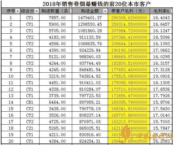 注:上表可以看出2018年卷煙商品獲利超過20萬以上的有5位客戶,其中排名全省第一的客戶通過卷煙商品盈利在2018年超過了29萬多,接近30萬的卷煙商品盈利水平。