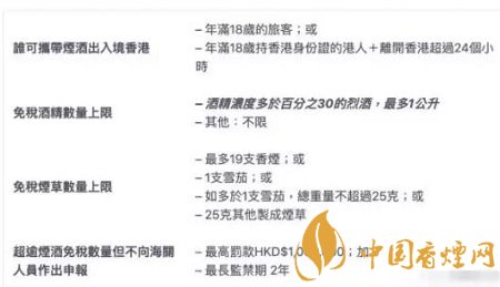 港海關(guān)規(guī)定,每個人最多可以攜帶19只香煙。超過規(guī)定數(shù)量,需要申報并且上稅。香港法律規(guī)定未申報超額香煙最高可判處監(jiān)禁2年、罰款100萬港幣。