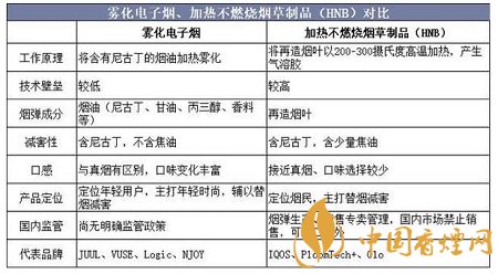 新型煙草是一種具備減害效果的尼古丁傳遞系統(tǒng),其煙氣中的有害物質(zhì),如焦油、一氧化碳等,含量遠(yuǎn)低于傳統(tǒng)卷煙。新型煙草可分為霧化電子煙、加熱不燃燒煙草制品(HeatNotBurning,HNB)兩大類(lèi),其中霧化電子煙又包括封閉式(霧化室為封閉系統(tǒng),換彈式)和開(kāi)放式(霧化室為開(kāi)放系統(tǒng),注油式)兩種。霧化電子煙和HNB的差異性主要體現(xiàn)在工作原理、煙彈成分、產(chǎn)品定位等方面。