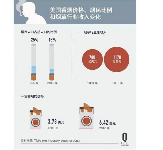 根據(jù)市場調研公司的報告,2001 年至 2016 年期間,美國香煙的銷售數(shù)量減少了 37%,與此同時,美國吸煙人口的比例也下降了,但煙草公司的利潤卻上升了。在2016 年,美國煙草行業(yè)的利潤達到了 184 億美元。(跟我國一比這好像都不算什么了)