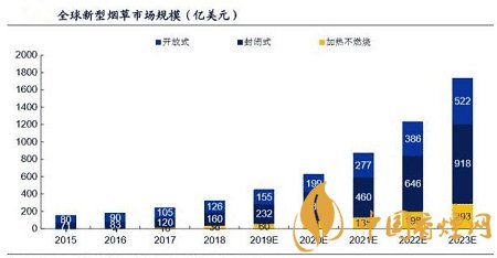 與傳統(tǒng)卷煙市場(chǎng)衰退呈鮮明對(duì)比的是新型煙草市場(chǎng)規(guī)模的逐年提升。全球新型煙 草市場(chǎng)規(guī)模以 27.9%的復(fù)合年增長(zhǎng)率從 2013 年的 94 億美元迅速增加至 2018 年的 323 億美元。弗若斯特沙利文預(yù)計(jì)到 2023 年全球新型煙草市場(chǎng)規(guī)模將高達(dá) 1734 億美元。新型煙草煙作為一種替代香煙的電子產(chǎn)品,有著與香煙類似的外 觀、煙霧、味道和感覺(jué)。而與香煙相比卻不含有香煙煙霧中的 7000 種有害化學(xué) 成分,因此受到越來(lái)越多人的青睞。