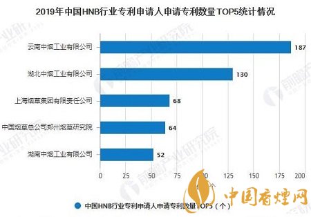 盡管我國現(xiàn)在暫未通過加熱不燃燒煙的銷售批準(zhǔn),但通過在Soopat上對“加熱不燃燒煙”的搜索,截至2019年年底,我國中煙集團(tuán)已經(jīng)加快加熱不燃燒煙相關(guān)領(lǐng)域的研發(fā),其中我國云南中煙工業(yè)有限公司對加熱不燃燒煙的申請數(shù)量最多,為187個,緊隨其后的是湖北中煙工業(yè)有限公司,申請數(shù)量130個。