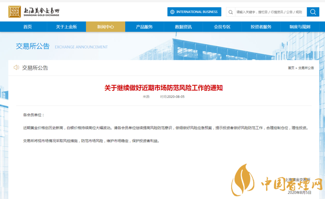8月5日,上金所發(fā)布公告稱,近期黃金價格創(chuàng)歷史新高,白銀價格持續(xù)高位大幅波動。請各會員單位繼續(xù)提高風(fēng)險防范意識,做細(xì)做好風(fēng)險應(yīng)急預(yù)案,提示投資者做好風(fēng)險防范工作,合理控制倉位,理性投資。