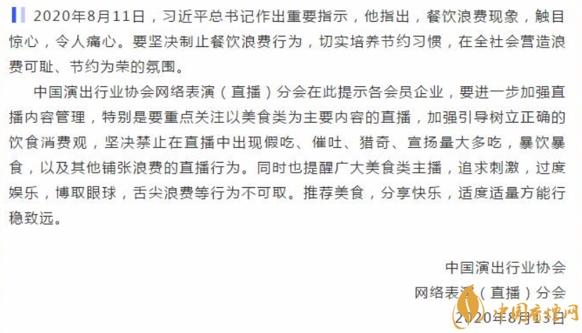 據(jù)中國(guó)演出行業(yè)協(xié)會(huì)官方微信消息,中國(guó)演出行業(yè)協(xié)會(huì)網(wǎng)絡(luò)表演 ( 直播 ) 分會(huì)在此提示各會(huì)員企業(yè),要進(jìn)一步加強(qiáng)直播內(nèi)容管理,特別是要重點(diǎn)關(guān)注以美食類為主要內(nèi)容的直播,加強(qiáng)引導(dǎo)樹(shù)立正確的飲食消費(fèi)觀,堅(jiān)決禁止在直播中出現(xiàn)假吃、催吐、獵奇、宣揚(yáng)量大多吃,暴飲暴食,以及其他鋪張浪費(fèi)的直播行為。同時(shí)也提醒廣大美食類主播,追求刺激,過(guò)度娛樂(lè),博取眼球,舌尖浪費(fèi)等行為不可取。推薦美食,分享快樂(lè),適度適量方能行穩(wěn)致遠(yuǎn)。