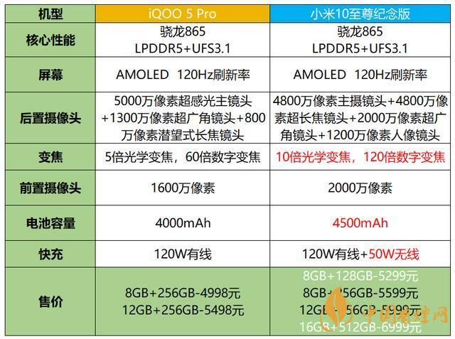 首先放上iQOO5 Pro版和小米10至尊紀(jì)念版的配置對(duì)比: