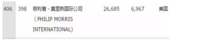 翻遍整個(gè)榜單,終于在末尾出發(fā)現(xiàn)了榜單唯一一家煙草公司--菲利普•莫里斯國(guó)際公司(簡(jiǎn)稱(chēng)菲莫國(guó)際,萬(wàn)寶路就是它家生產(chǎn)的),以營(yíng)收266.85億美元、利潤(rùn)69.67億美元排名世界500強(qiáng)第406位。