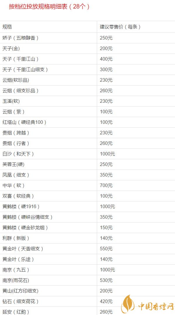 D類(lèi):嬌子寬窄逍遙、嬌子寬窄逍遙細(xì)支、嬌子紅韻新、鉆石荷花、云煙軟大重九、白沙細(xì)支和天下、天子壹號(hào)。參考價(jià)段為:?jiǎn)螚l批發(fā)價(jià)380元及以上共4個(gè)價(jià)段。