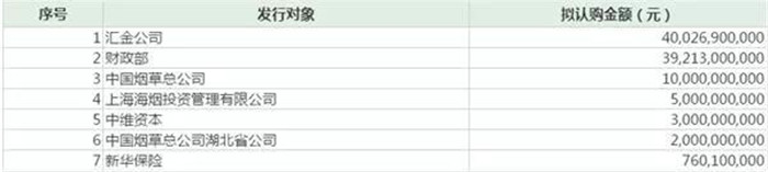 除去匯金公司和財(cái)政部,其余的發(fā)行對象中,中國煙草總公司、上海海煙投資管理有限公司、中維資本、中國煙草總公司湖北省公司四家均為“煙草系”法人。