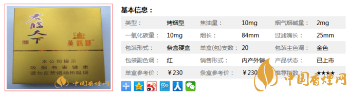黃鶴樓君臨天下2300元/條,230元/包。香氣均勻和諧,外觀精致,因?yàn)閮r(jià)格較高,此前一再被網(wǎng)友拿來(lái)炒作,以致于現(xiàn)在在國(guó)內(nèi)都很少有這款煙流通,外銷占比較大。黃鶴樓品種較多,口感方面也是因人而異,具體細(xì)節(jié)還是看個(gè)人習(xí)慣。
