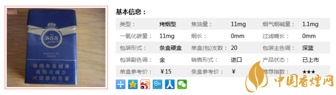 555牌卷煙創(chuàng)牌于1895年,是英美煙草公司出品的有著悠久歷史的著名品牌,國(guó)內(nèi)煙民熟悉的有555金、555弘博、555環(huán)尊、555藍(lán)尚、555國(guó)際等品種和系列。555屬英式烤煙型卷煙,以其“醇和口味”和前衛(wèi)時(shí)尚的文化風(fēng)格風(fēng)靡世界。下面就由香煙網(wǎng)小編帶大家一起來(lái)了解一下555配方555·金的詳細(xì)信息。