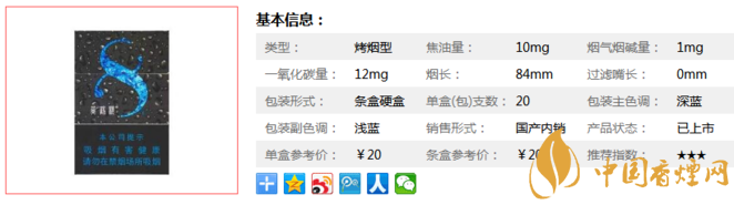 | 類型 :烤煙型 | 焦油量 :8mg | 煙氣煙堿量 :0.8mg | 一氧化碳量 :10mg |