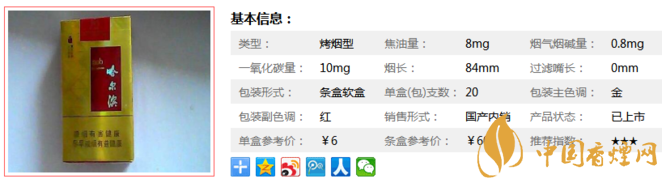| 類型 :烤煙型 | 焦油量 :8mg | 煙氣煙堿量 :0.8mg | 一氧化碳量 :10mg |