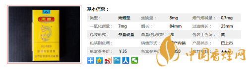 | 類型 :烤煙型 | 焦油量 :8mg | 煙氣煙堿量 :0.7mg | 一氧化碳量 :7mg |