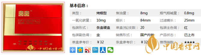 | 類型 :烤煙型 | 焦油量 :8mg | 煙氣煙堿量 :0.8mg | 一氧化碳量 :10mg |