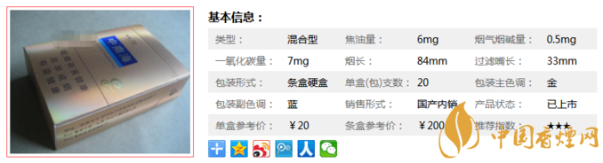煙長(zhǎng):84mm 過(guò)濾嘴長(zhǎng):33mm 包裝形式:條盒硬盒 單盒(包)支數(shù):20