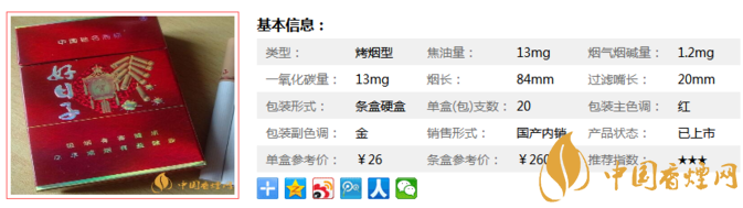 | 類型 :烤煙型 | 焦油量 :13mg | 煙氣煙堿量 :1.2mg | 一氧化碳量 :13mg |