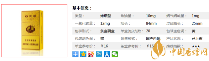 | 類型 :烤煙型 | 焦油量 :10mg | 煙氣煙堿量 :1mg | 一氧化碳量 :12mg |
