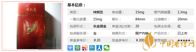 | 類(lèi)型 :烤煙型 | 焦油量 :13mg | 煙氣煙堿量 :1.2mg | 一氧化碳量 :13mg |