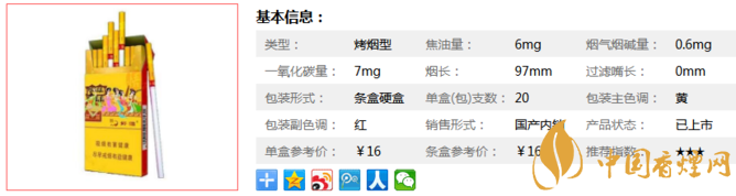 | 類(lèi)型 :烤煙型 | 焦油量 :6mg | 煙氣煙堿量 :0.6mg | 一氧化碳量 :7mg |