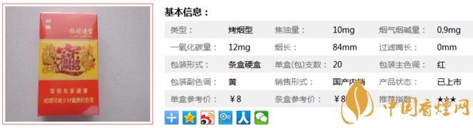 | 類型 :烤煙型 | 焦油量 :10mg | 煙氣煙堿量 :1mg | 一氧化碳量 :13mg |