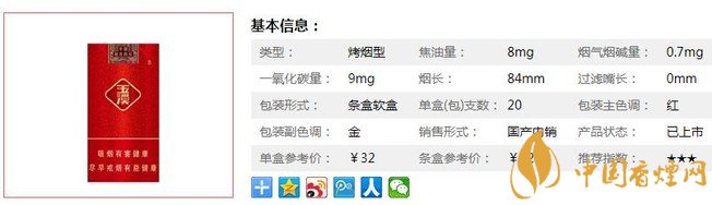 | 煙長:84mm | 過濾嘴長:25mm | 包裝形式:條盒軟盒 | 單盒(包)支數(shù):20 |