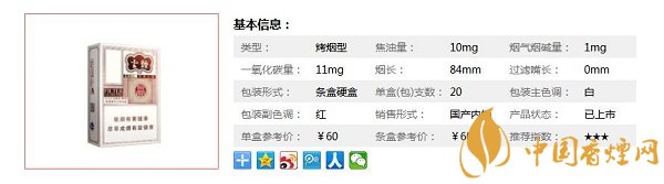 | 類(lèi)型 :烤煙型 | 焦油量 :10mg | 煙氣煙堿量 :1mg | 一氧化碳量 :11mg |