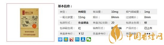 | 類(lèi)型 :烤煙型 | 焦油量 :10mg | 煙氣煙堿量 :1mg | 一氧化碳量 :11mg |