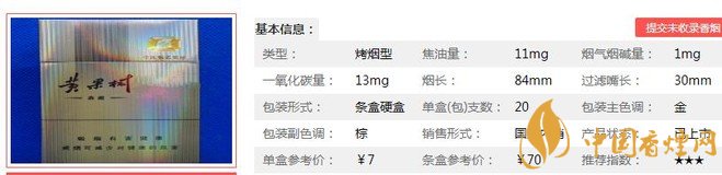 | 煙長(zhǎng):84mm | 過濾嘴長(zhǎng):30mm | 包裝形式:條盒硬盒 | 單盒(包)支數(shù):20 |