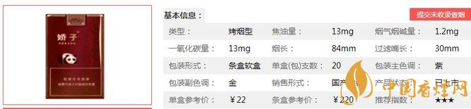 嬌子軟紫國寶煙支長84mm,過濾嘴長:30mm,該款產(chǎn)品采用了具有自主知識產(chǎn)權(quán)的復(fù)合生化減害技術(shù),能夠明顯降低煙氣中的有害物質(zhì)。下面我們一起來看嬌子軟紫國寶的參數(shù)信息:焦油量:13mg 煙堿量:1.2mg 一氧化碳量:13mg