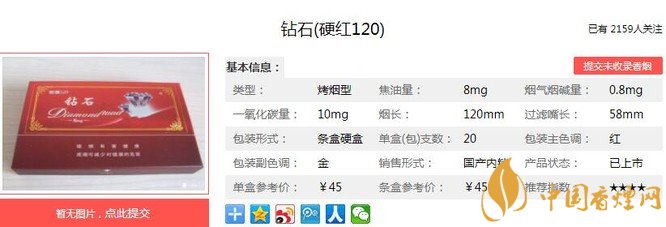對所有原料進(jìn)行科學(xué)的理化分析,選用了香氣足、煙堿高、焦油低的巴西、津巴布韋及國內(nèi)優(yōu)質(zhì)且自然醇化的煙葉。香煙價位中等,質(zhì)量比較不錯,在市場上獲得高端消費者的認(rèn)同和追捧。經(jīng)香煙網(wǎng)小編市場調(diào)查鉆石硬紅120售價為45元/包。