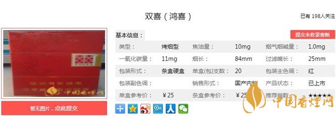 其所選用的煙葉全部來自于海拔1200米以上的山地生態(tài)煙葉,保證了原料上的優(yōu)越性,配以廣東中煙自主研發(fā)的三元復(fù)合濾嘴,起到了增香、保潤、提純的作用,使鴻喜產(chǎn)品的煙氣柔和綿長,口感圓潤生津,香氣飽滿透發(fā),真正做到了剛?cè)岵?jì)。經(jīng)香煙網(wǎng)小編市場調(diào)查雙喜鴻喜售價為25元/包。