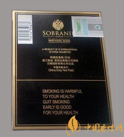 包裝采用了黑色為底色,顏色較偏暗,以金色為輔。金色logo立于正面其上,相當醒目。logo之下為SOBRANIIE幾個字母,最下面為警示語“吸煙有害健康盡早戒煙有益健康”,顯眼奪目,立體感很強,磨砂手感,既炫且酷,包裝精美大氣。