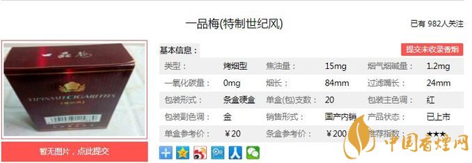 品梅世紀(jì)風(fēng)煙氣甜韻圓潤、柔綿舒適、入喉清新豐滿、順暢、醇綿、飽滿、輕靈,此煙還是很不錯的,口感著實純正飽滿,醇厚干凈。經(jīng)香煙網(wǎng)小編市場調(diào)查一品梅世紀(jì)風(fēng)售價為20元/包。