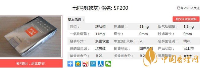 七匹狼軟灰亦稱七匹狼(SP200),精選國內(nèi)外優(yōu)質(zhì)烤煙,人工片選精華,運(yùn)用國際先進(jìn)的無氟及過濾技術(shù)、HXD烘絲工藝,由全新的國際一流廠房和設(shè)備精工制作,氣質(zhì)卓越優(yōu)雅,品味自然純正,煙草本香流露無遺,是比較經(jīng)典的具有較高性價(jià)比的狼煙。經(jīng)香煙網(wǎng)小編市場(chǎng)調(diào)查七匹狼軟灰售價(jià)為21元/包。
