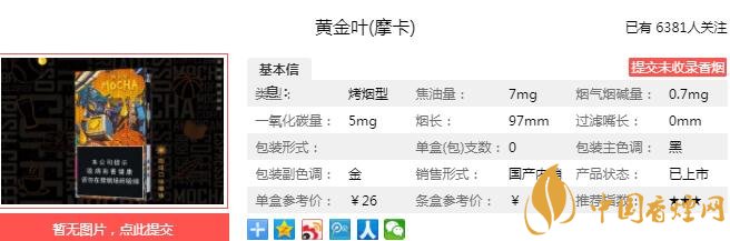 黃金葉摩卡煙支長97mm,煙嘴設(shè)計為暗金色,甜甜的有點像煊赫門,煙支拿在手上十分舒適。下面我們一起來看黃金葉摩卡的參數(shù)信息:焦油量:7mg 煙堿量:0.7mg 一氧化碳量:5mg