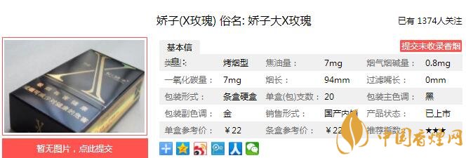 嬌子X玫瑰煙支長94mm,嬌子(X玫瑰)開啟方式比較特別,采用了底部開啟煙盒的方式。94mm的超長煙支,纖細(xì)、挺拔而不失雋秀。下面我們一起來看嬌子X玫瑰的參數(shù)信息:焦油量:7mg 煙堿量:0.8mg 一氧化碳量:7mg