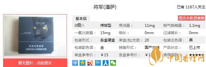 將軍(潘薩)這款雪茄型卷煙能夠在上市初期就收到了不錯的市場凡響,這就離不開“將軍”品牌較為知名的背書效應,尤其是在山東省內(nèi)將軍(潘薩)更是受到了本省消費者的追捧。作為一款獨具特色的雪茄型卷煙,將軍(潘薩)在受到本省消費者追捧的同時,也成為了來山東旅游的外地游客青睞的一款山東產(chǎn)的雪茄型卷煙。經(jīng)香煙網(wǎng)小編市場調(diào)查將軍潘薩售價為15元/包。