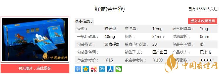 采用了生長于秦嶺海拔600-900米的有機煙葉,湊近嗅聞卻有些云南煙草的神韻,比之少了一些發(fā)酵氣息,而多了一絲清甜芬香,香氣方面以煙草本香為主,無明顯的人工添香。香煙最大的特點就是在吸食的滿足感和舒適感之間平衡的非常出色。經(jīng)香煙網(wǎng)小編市場調(diào)查好貓金絲猴售價為15元/包。