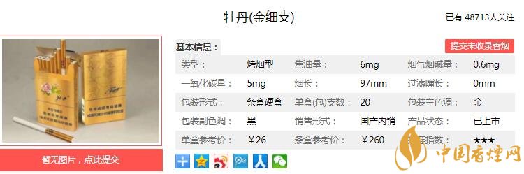 牡丹金細支口味傳承并發(fā)揚牡丹品牌的文化底蘊和風格特點,進一步提升卷煙的吸食品質(zhì),香氣細膩豐富,特征風格明顯,煙氣順暢,嗅香獨特,余味干凈。經(jīng)香煙網(wǎng)小編市場調(diào)查牡丹金細支售價為26元/包。
