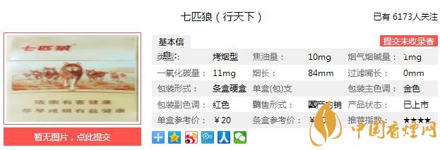 七匹狼行天下煙支長(zhǎng)84mm,過濾嘴長(zhǎng)34mm,卷紙采用橫紋結(jié)構(gòu),以手捏之,柔軟而充滿彈性。以鼻嗅之,煙草本香氣息不濃,夾雜著果木之香的氣味,充斥著鼻翼。下面我們一起來(lái)看七匹狼行天下的參數(shù)信息:焦油量:10mg 煙堿量:1.0mg 一氧化碳量:11mg