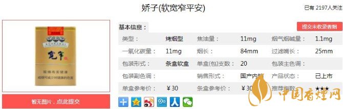 綜合來說嬌子(寬窄平安)的質量還是可以保證的。它有著寬窄系列香煙傳統(tǒng)的口感和味道,細膩而香醇。只是相比其它款式的寬窄,在某一品評指標上,稍有些差距。但是橫向比對相同價位其它品牌的香煙,平安的優(yōu)勢,還是存在的,售價在30元一包。