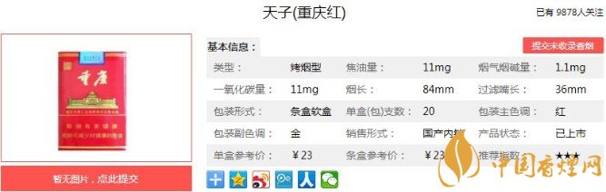 天子(重慶紅)三項(xiàng)理化指標(biāo)都是11mg或其倍數(shù),印有二維碼。激光防偽鐳射簽內(nèi)容,與煙盒正面一樣。過濾嘴下端還多了一圈金箍,并且卷紙上沒有圖案。過濾嘴也要比中華長了一些,為36mm。過濾嘴上沒有單排或多排的降焦線。下面便是基本參數(shù):焦油量:11mg 煙堿量:1.1mg 一氧化碳量:11mg.