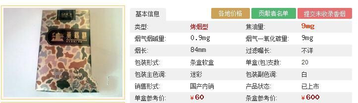 黃鶴樓香煙大彩(硬)綜合應用國內多產區(qū)煙葉,凸顯立體吸味。在配方技術上,充分利用增香功能薄片、亮色煙等復合配方技術,在豐富了產品香韻,降低焦油至6毫克。黃鶴樓大彩的煙支采用了焦油標尺刻度,消費者可以輕松了解并掌控攝入的焦油含量。采用大漠迷彩紋飾,賦予產品特別的身份象征,與其他產品形成天然的視覺區(qū)隔,帶、一股特別的時尚硬朗氣息。
