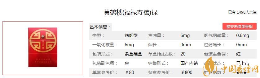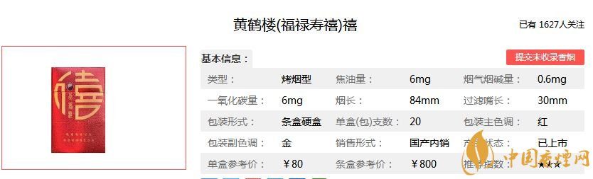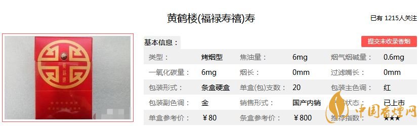 福祿壽喜代表著吉祥安康的寓意,黃鶴樓香煙為此開發(fā)出的黃鶴樓福祿壽喜香煙,福代表幸福美滿;祿代表升官發(fā)財;壽代表健康長壽;喜代表喜事。黃鶴樓福祿壽喜價格及參數(shù)如下: