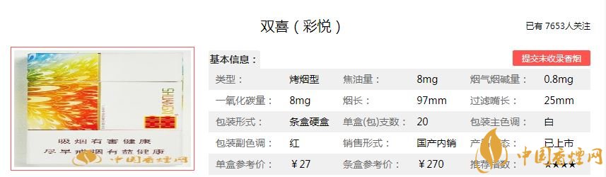 這款煙在廣東反而不多見(jiàn),包裝簡(jiǎn)約之中有炫目多彩的時(shí)尚氣息。雙喜彩悅沒(méi)有降低煙氣的凹槽,也無(wú)兩排細(xì)細(xì)的降焦線,絕對(duì)的素面朝天。香煙價(jià)位中等,但是質(zhì)量比較不錯(cuò),值得一品。經(jīng)調(diào)查雙喜彩悅售價(jià)為27元/包。