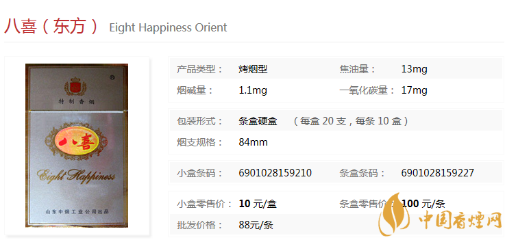 “八喜”煙是山東青州卷煙廠93年推出了“南有紅塔山,北有八喜煙”的促銷宣傳口號(hào),推出了“八喜”香煙。1996年榮獲全國名優(yōu)卷煙"一等品"殊榮,1999年被評(píng)為山東八大名牌之一。